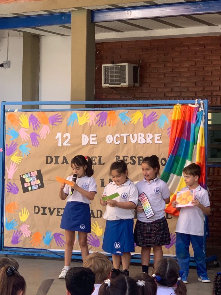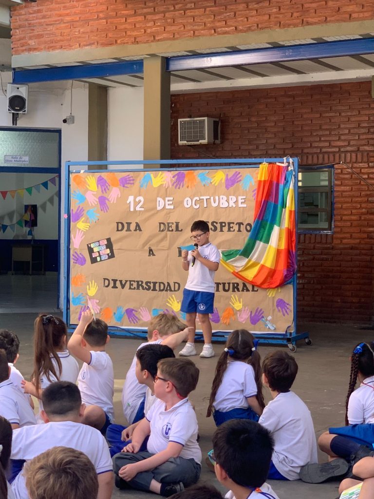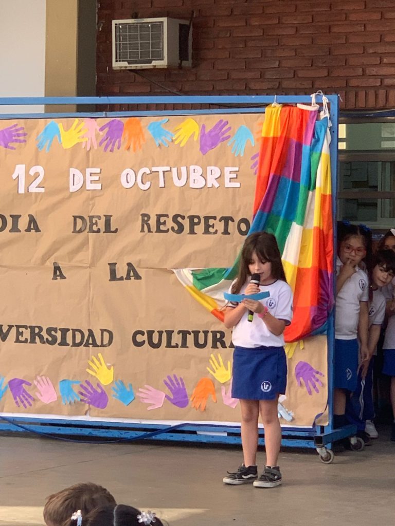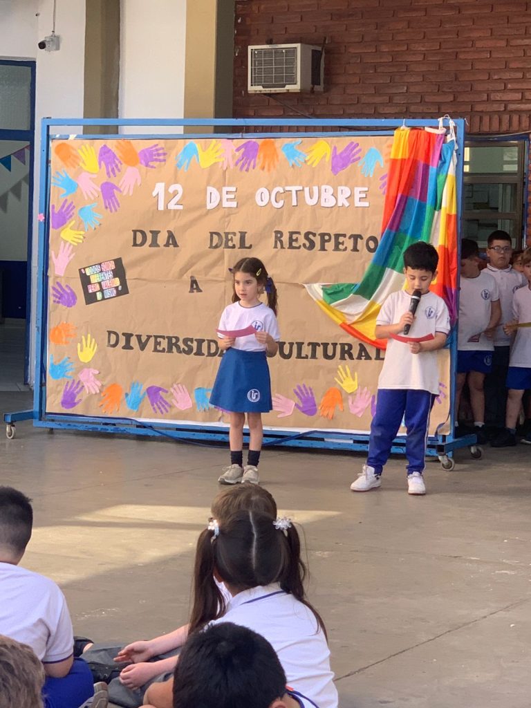 Los alumnos de primer grado, junto a sus seños Nadia y Coca, compartieron con toda la escuela lo trabajado en el marco del Día de la Diversidad Cultural.