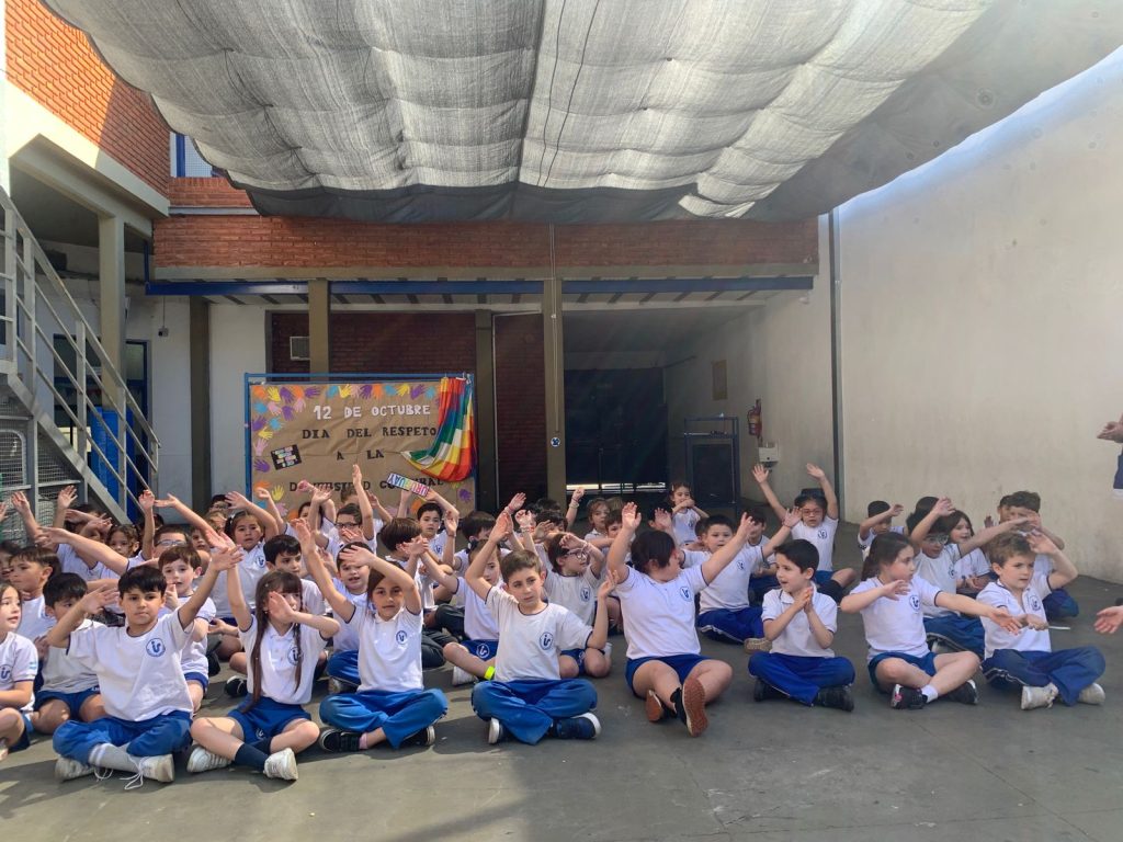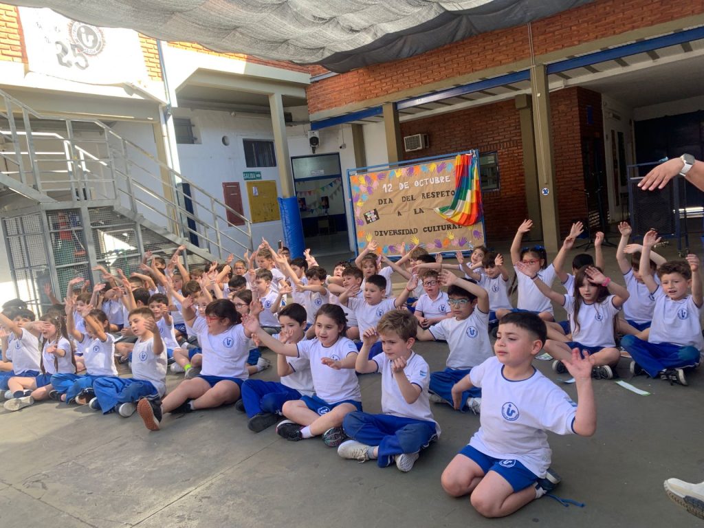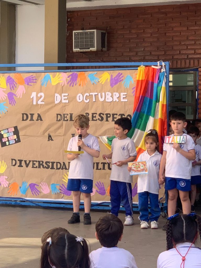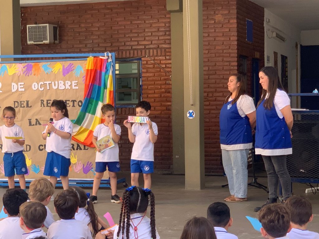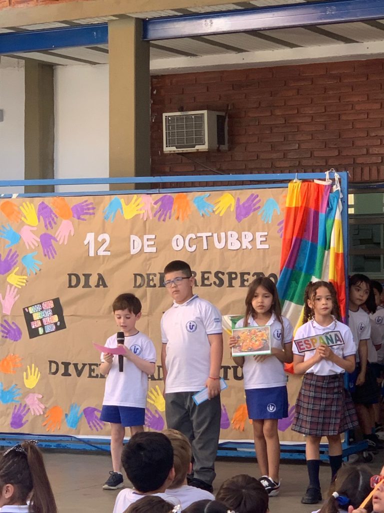 Los alumnos de primer grado, junto a sus seños Nadia y Coca, compartieron con toda la escuela lo trabajado en el marco del Día de la Diversidad Cultural.